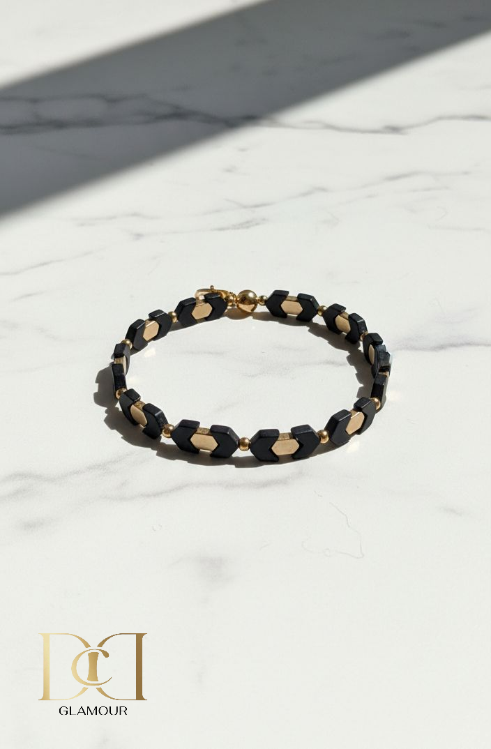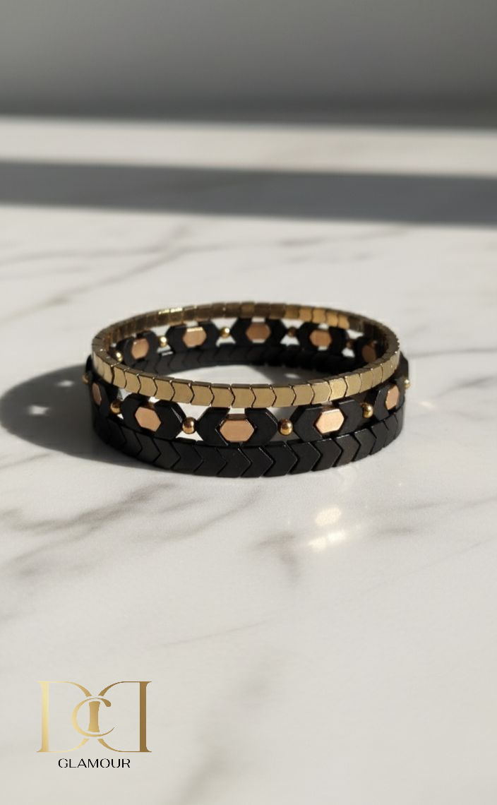 A striking blend of gold and black, crafted for the woman who loves contrast and balance in her style. Dual Fusion offers a unique look that transitions seamlessly from day to evening, giving you endless styling power in one refined piece.