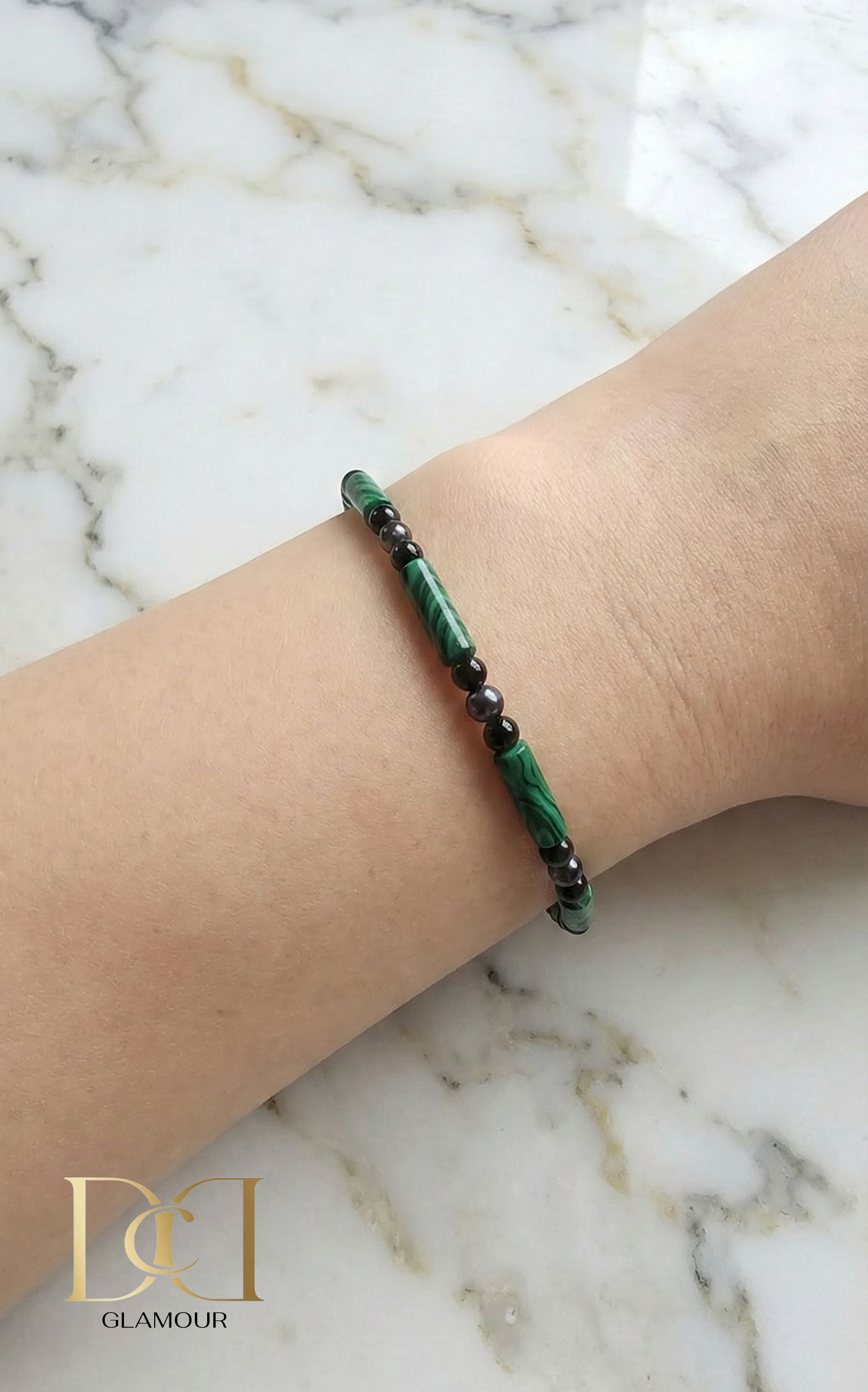 Charcoal Hematite, Black Agate, Green Glass and Elastic Cord.