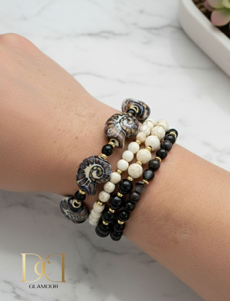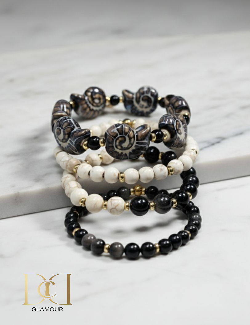 Gold-Plated Brass, Howlite, Silver Obsidian and Elastic Cord