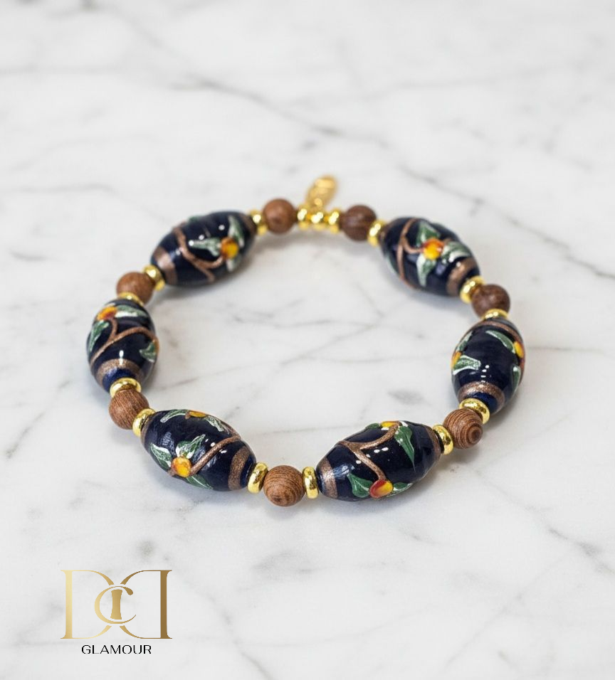 Lampwork Glass, Wood, Gold-Plated Brass and Elastic Cord