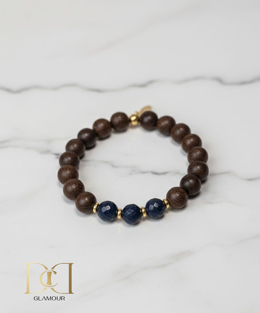 Blue Jade, Wood, Gold-Plated Brass and Elastic Cord